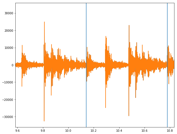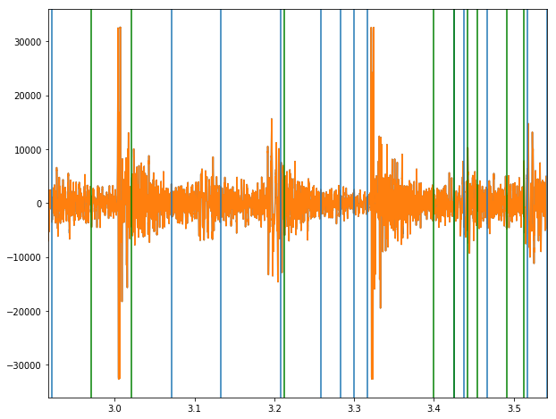 En este enfoque el único parámetro a detereminar es el umbral para considerar válido un máximo local de la aceleración. Observamos que para el umbral elegido tenemos un falso positivo en el fragmento mostrado, y dos golpes presentes en audio que no surgen de analizar el palo izquierdo (mirando de frente).