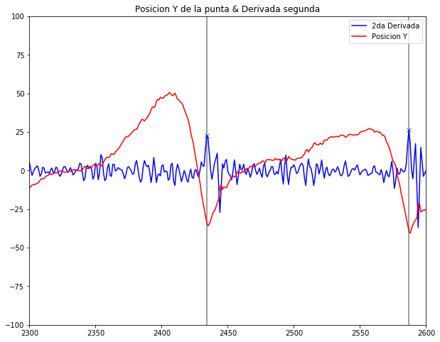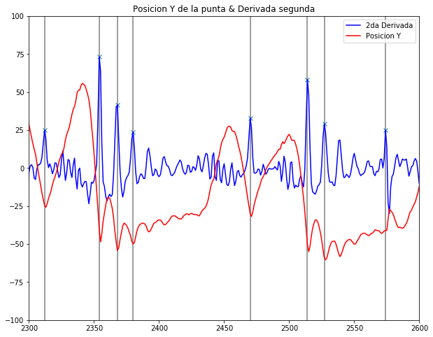 Finalmente, a partir de la posición de dicho segmento en función del tiempo se probó un posible abordaje para determinar los instantes en los que ocurre un golpe.